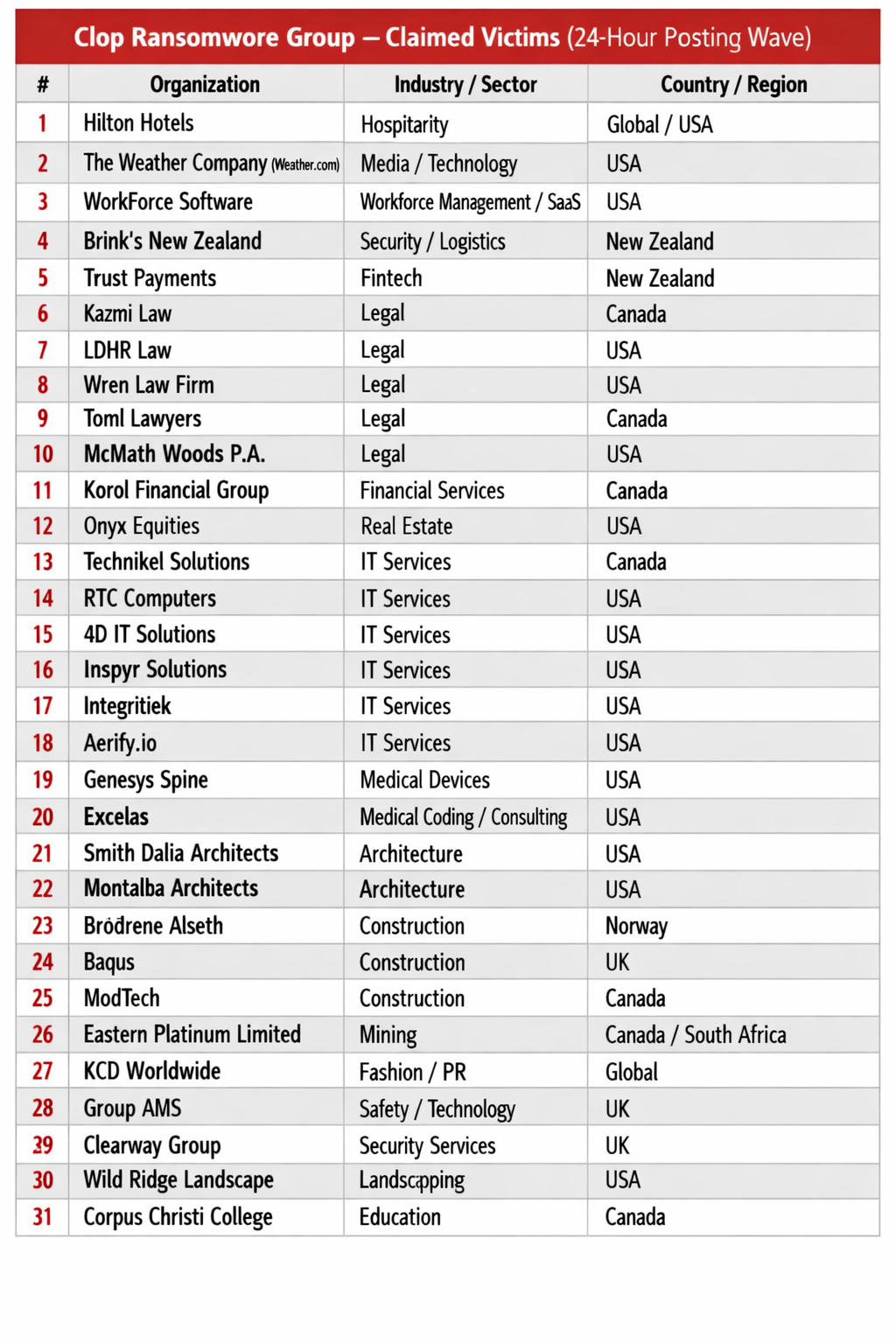 The Clop ransomware group has posted 43 new victims to its dark web leak site within a 24-hour period, targeting organizations across the United States, Canada, United Kingdom, Europe, and New Zealand. The wave of listings includes major brands such as Hilton Hotels and The Weather Company, parent of Weather.com.