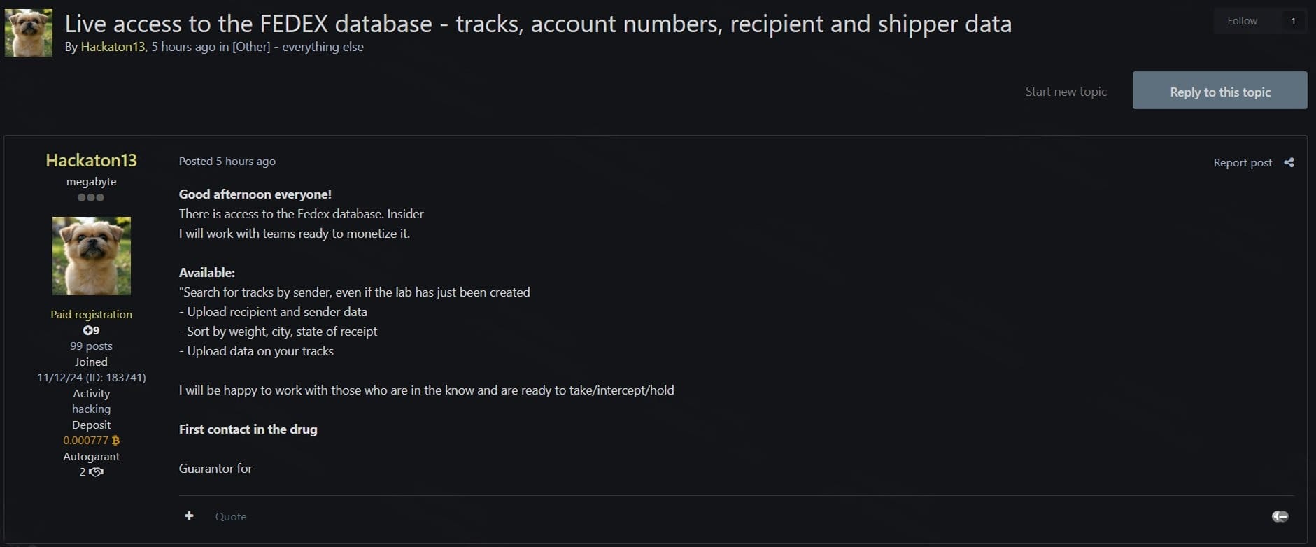 The authenticity of the alleged access has not been independently verified. FedEx has not publicly commented on any insider compromise. Claims of insider access on cybercrime forums are sometimes exaggerated or fabricated to attract buyers.