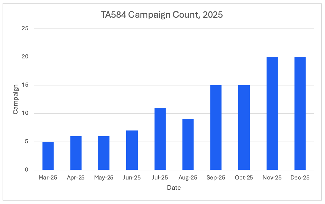 Recent activity shows a sharp increase in campaign frequency throughout 2025, with the operational tempo accelerating significantly. This high-velocity approach allows TA584 to evade detection and takedown efforts while maximizing the window for successful compromises.