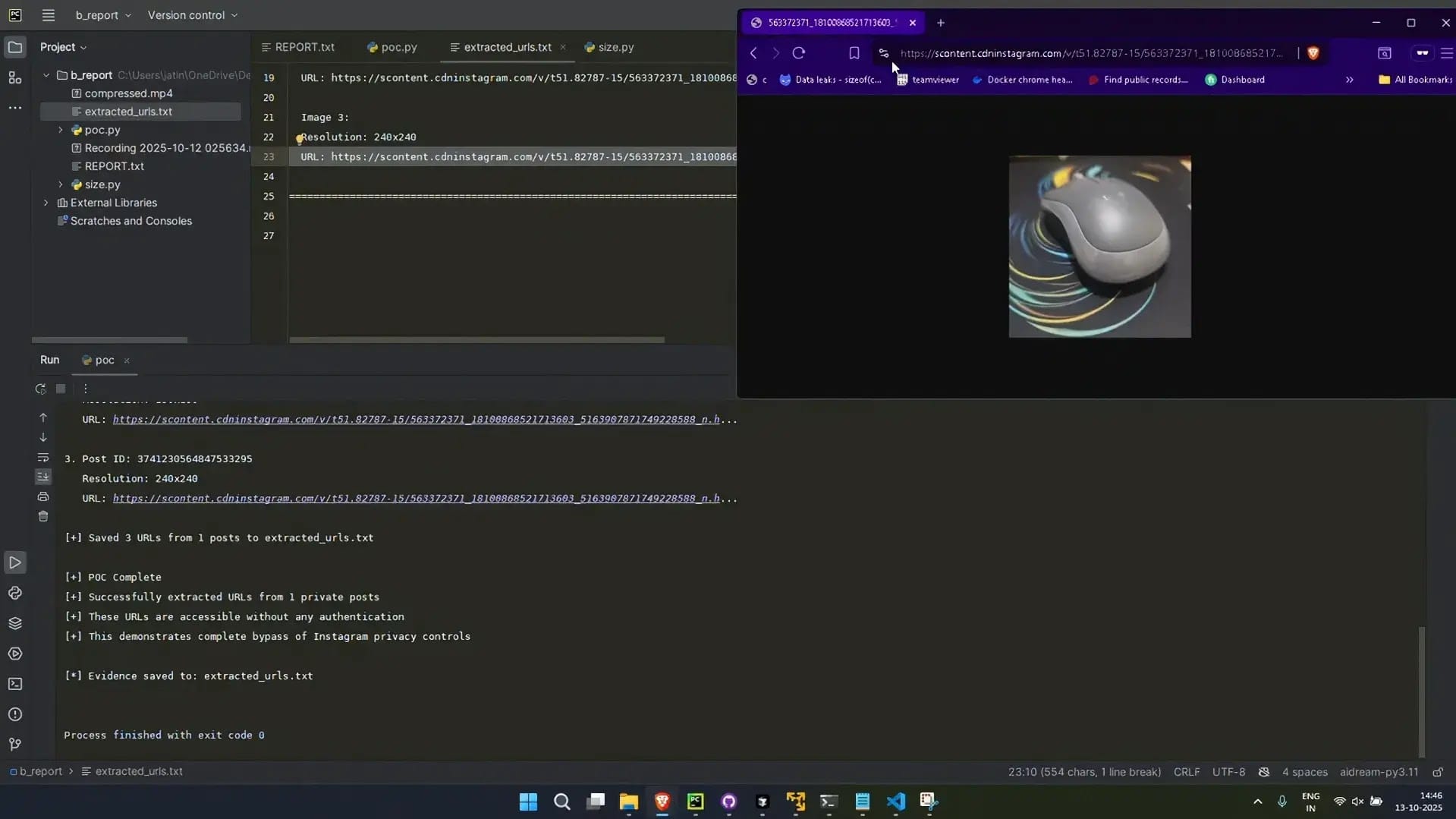 Banga discovered the vulnerability while building a workflow automation tool for HTTP requests. While examining Instagram's mobile web responses, he noticed CDN links being returned for content that should not have been accessible—private posts, full resolution images, and captions all embedded in HTML responses to unauthenticated requests.