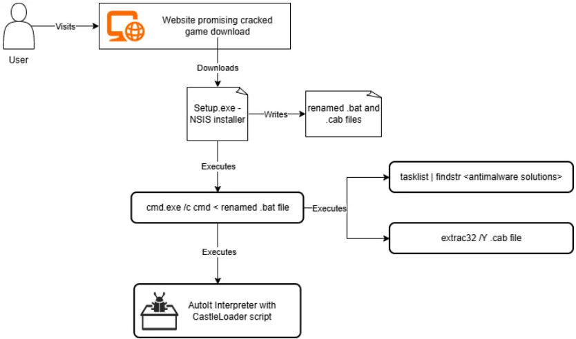 CastleLoader executes entirely in-memory, using AutoIT or Python scripts with multiple obfuscation layers — dictionary-based variable renaming, runtime string decoding, junk code injection, and arithmetic operations that resolve to trivial results. Before deploying its payload, it performs environment and sandbox checks and adjusts file paths based on which security products are detected on the host.