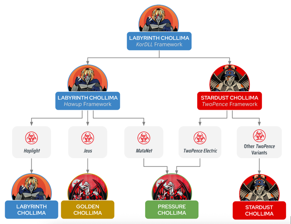 All three groups trace their lineage to the KorDLL malware framework (2009-2015), which spawned epoch-defining malware including Dozer, Brambul, Joanap, and eventually the Hawup framework used by modern LABYRINTH CHOLLIMA operations.