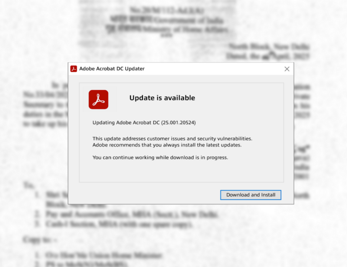 The campaign begins with spear-phishing emails containing PDF documents that display blurred images of legitimate government materials. The PDFs present a fake Adobe Acrobat update prompt with a "Download and Install" button to trick victims into downloading a malicious ISO file.