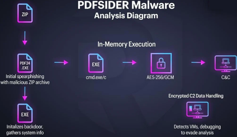 PDFSider is delivered through spearphishing emails containing ZIP archives with a legitimate PDF24 Creator executable bundled with a malicious DLL. The malware exploits DLL side-loading by masquerading as cryptbase.dll, a legitimate Windows system file.
