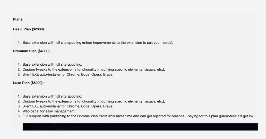 The $6,000 price tag likely reflects the value of the Chrome Web Store publication guarantee and management panel rather than code complexity. The guarantee represents the real commercial value, providing buyers with distribution through a trusted channel that most users consider safe.