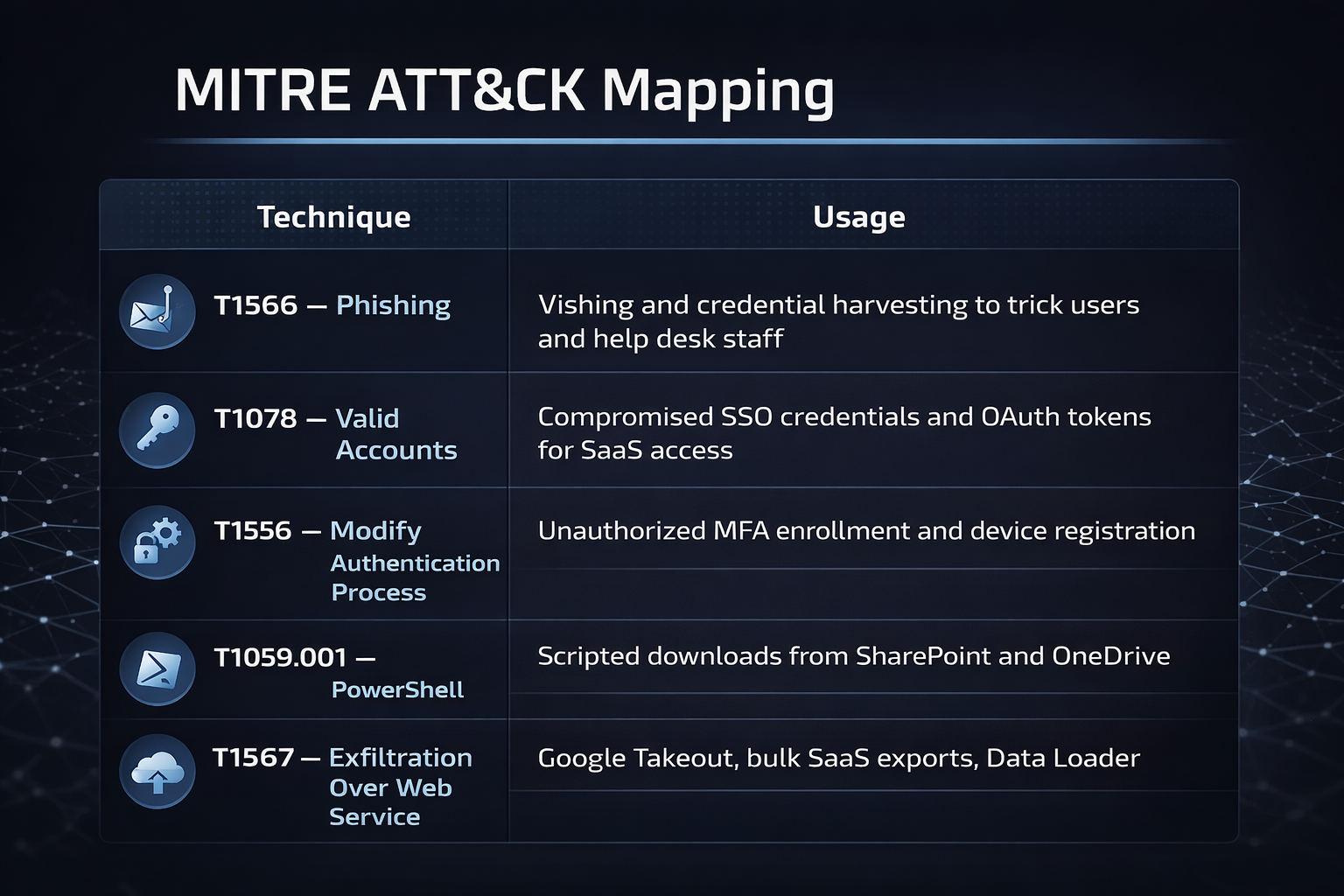 Mandiant stresses that without proper visibility into identity actions, authorizations, and SaaS export behaviors, detection is effectively impossible — organizations often remain unaware of a compromise until an extortion note arrives.
