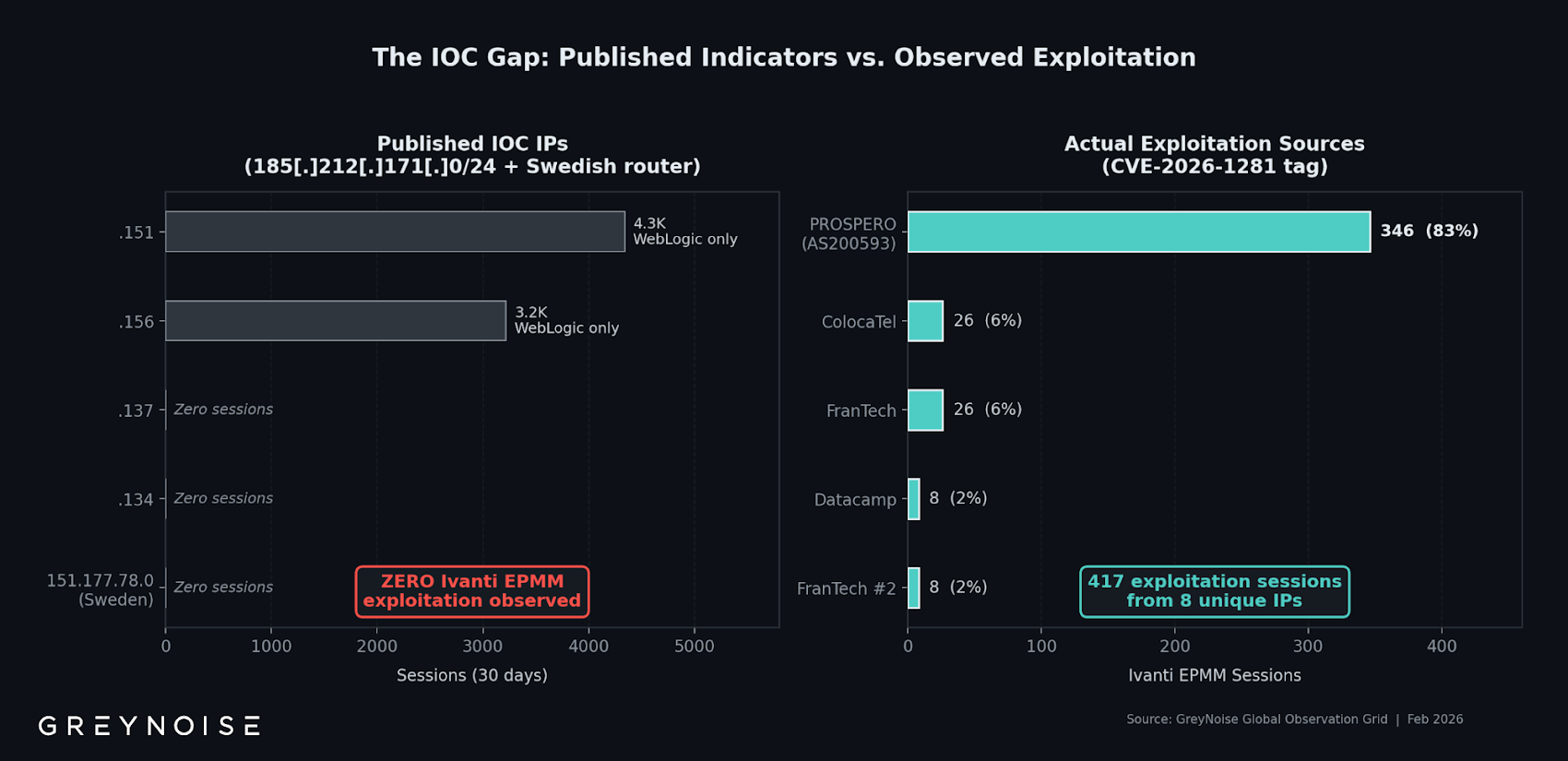 Threat intelligence firm GreyNoise recorded 417 exploitation sessions from 8 unique source IPs between February 1-9, with 346 sessions — 83% of the total — originating from 193.24.123[.]42 on infrastructure operated by PROSPERO (AS200593).